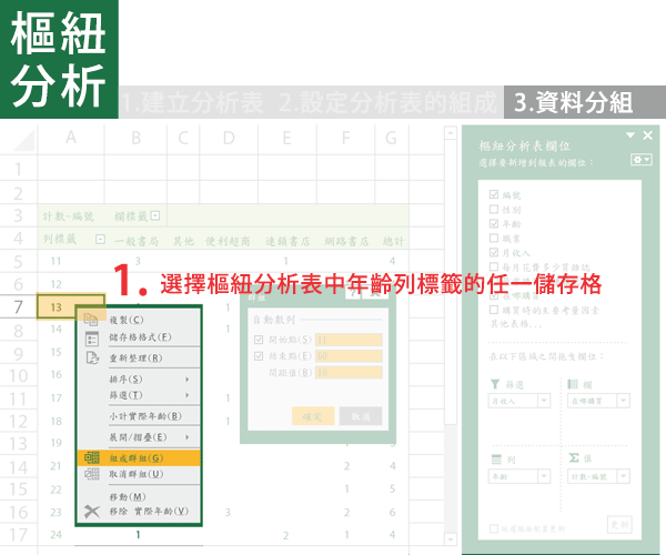1.選擇樞紐分析表中、年齡列標籤的任一儲存格